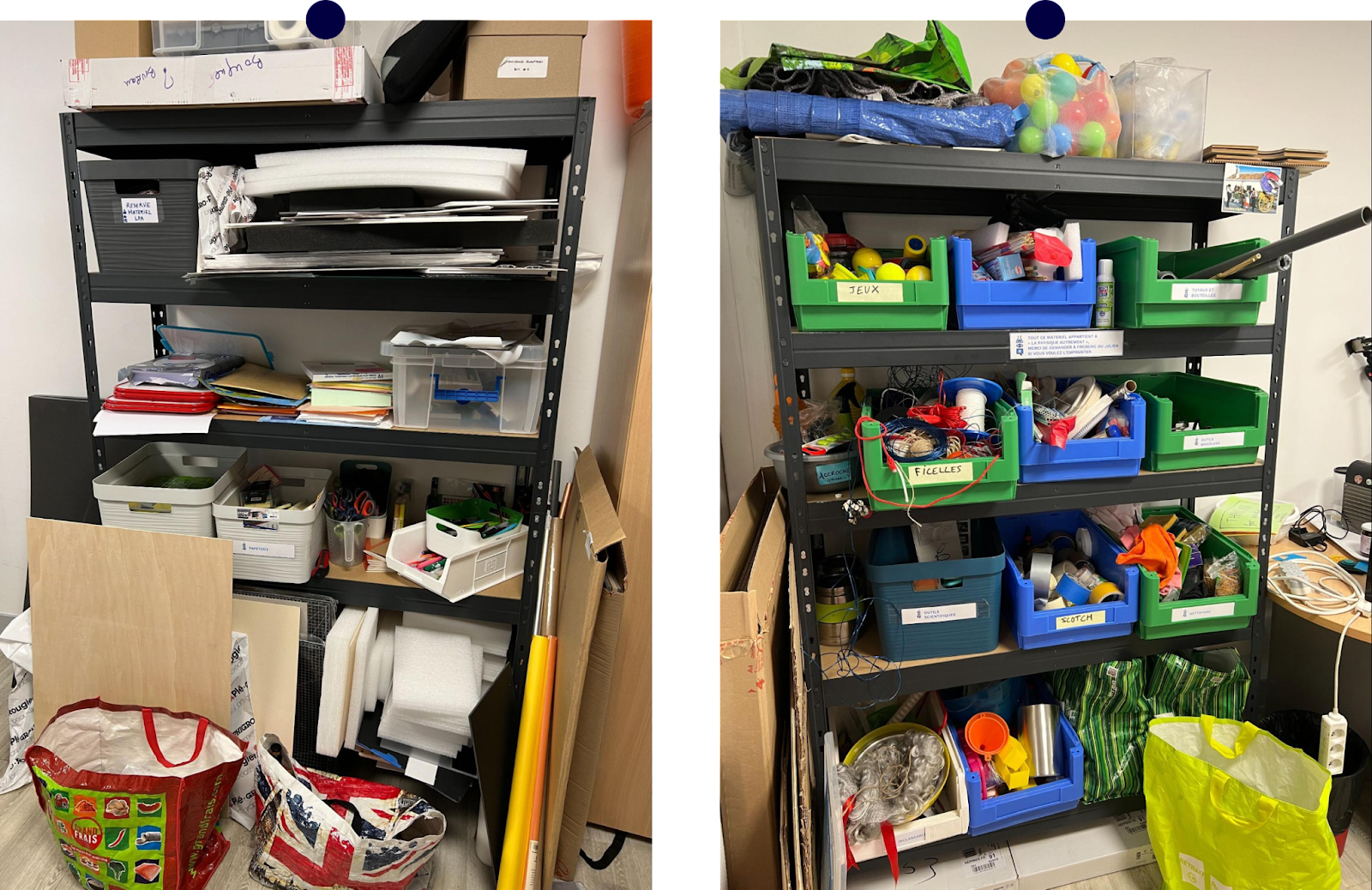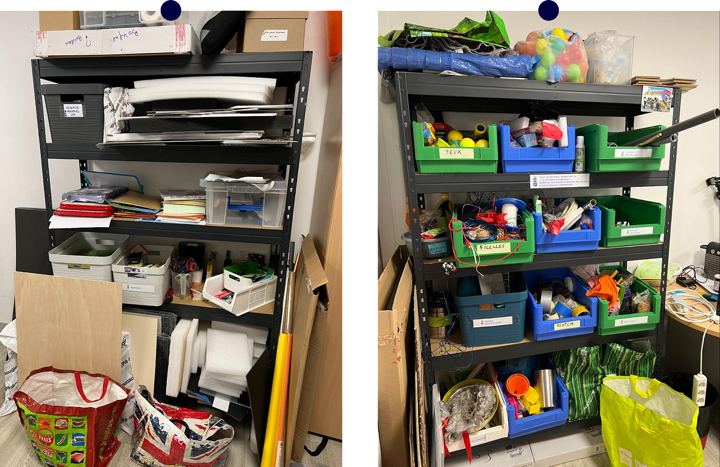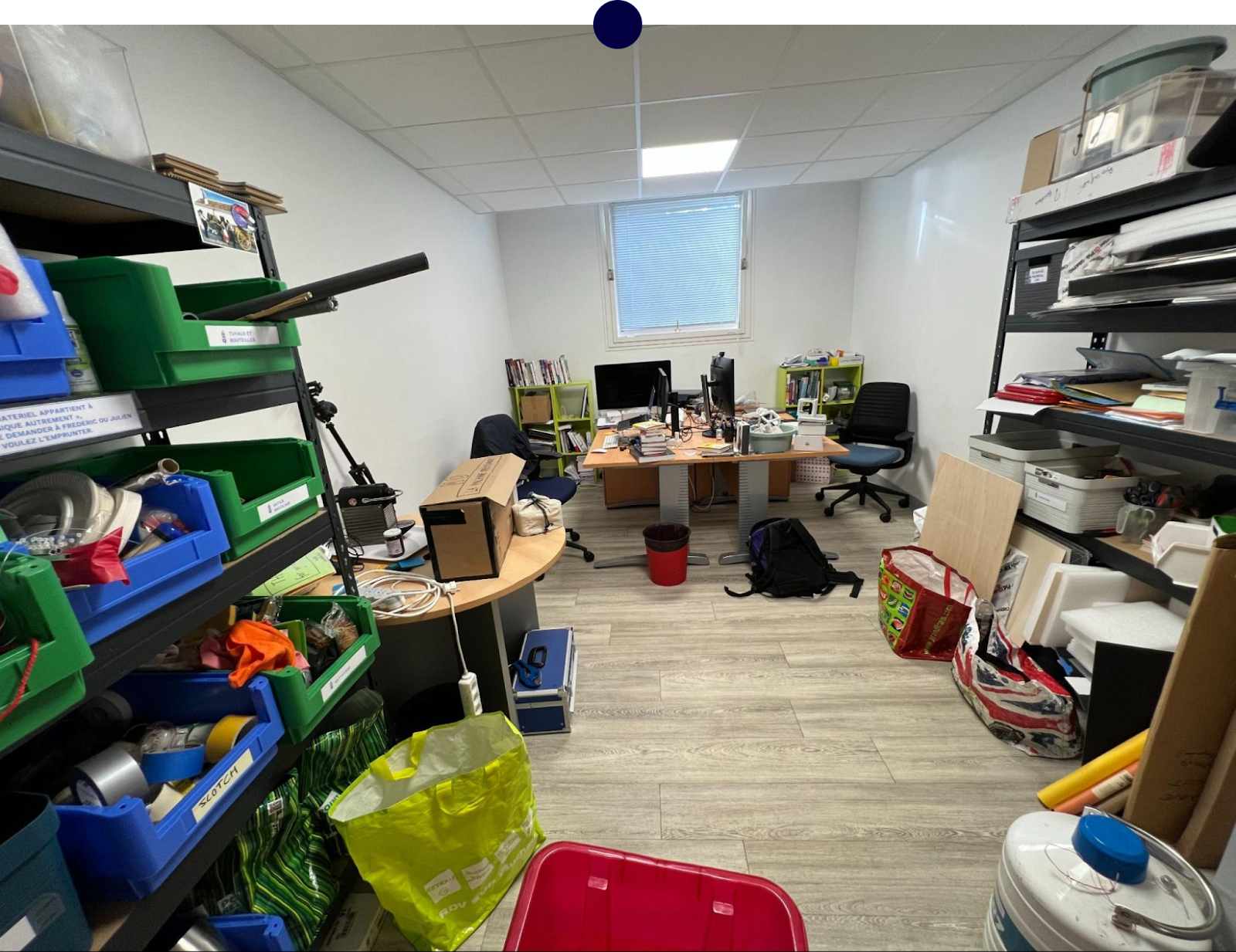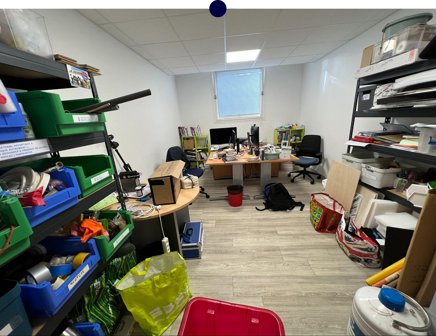 Dans mon bureau, il y a plein de livres à lire, les ordis, la machine à café, et surtout tout un matériel bric-à-brac très intéressant pour faire du petit prototypage, pour nous comme pour nos étudiants lors d’enseignements pratiques. On a classé ça dans des grands tiroirs en plastique, et il suffit de choisir lesquels emmener pour chaque enseignement. Très pratique !